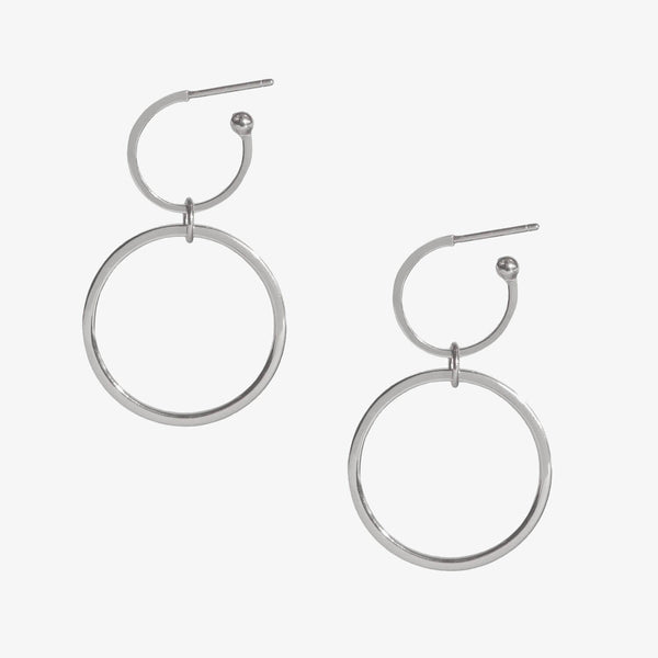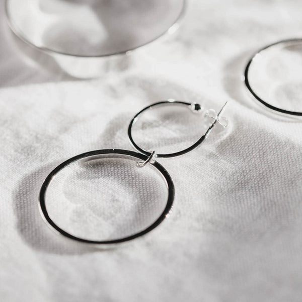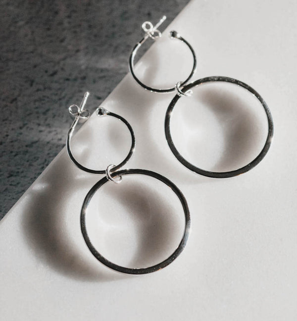 Designed in the signature Matthew Calvin geometric, minimalist style, the Sterling Silver Double Ring Hoops are a statement piece. Designed with the option to remove the larger hoop for versatility; two pairs of earrings in one! Created with movement in mind, the Double Ring Hoops feature a larger circle, hanging freely from a smaller hoop.