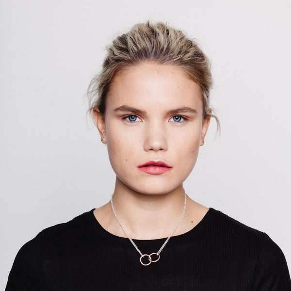 Two perfectly intertwined Rose Gold Vermeil circles are suspended from a signature Matthew Calvin double Sterling Silver chain. The necklace sits comfortably on the collar bone, looks stunning worn alone, or layered with longer styles. A classic Matthew Calvin design, the Double Meteorite Ring Necklace has been a customer favourite since its' launch.