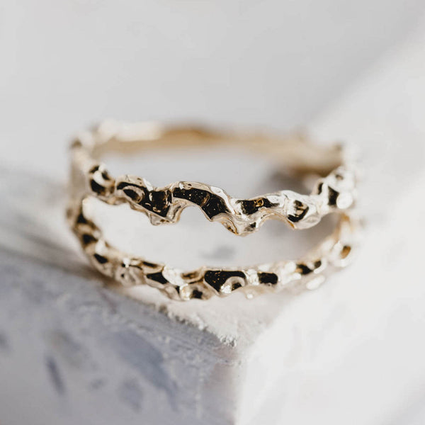 The Double Meteor Ring is a stunning statement ring that forms part of the Meteorite collection. A unique, unusual and intriguing piece. Inspired by his training in pattern-cutting, designer Matthew Calvin applied his experience in design to make these through the principle of ‘working backwards’, using the lost wax casting method. The result is a range of solid, weighty pieces which are hand-finished rather than machine-finished.