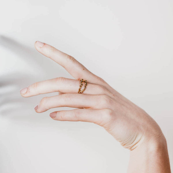 Model's hand wearing one Double Meteor Ring with rose gold vermeil plating