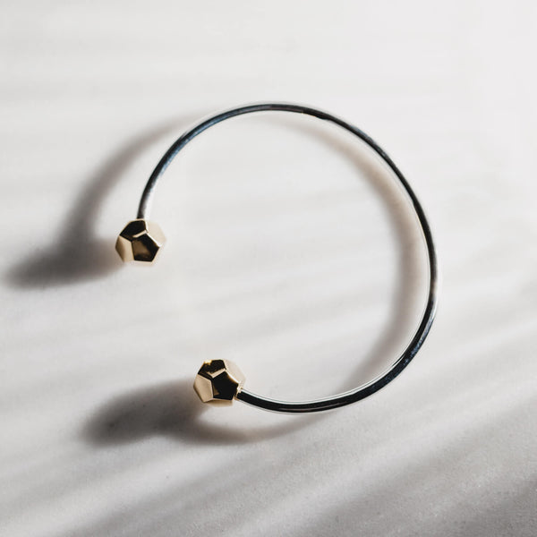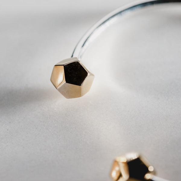 The Double Dodecahedron Bangle is a solid, weighty design. The open circle of the Sterling Silver bangle ends in a 3D printed dodecahedron charm on each end, making this a pleasingly chunky piece of jewellery, very modern, and completely unisex. This open bangle can be adjusted slightly to the wearer's size preference, making it the perfect gift. Available in Gold and Rose Gold Vermeil, where the bangle remains silver and the charms are carefully plated with gold or rose gold.