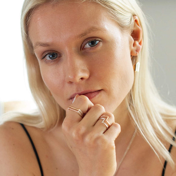 The Machinist Ring, another of the Matthew Calvin's signature pieces, is as interesting as it is unique; solid, yet delicate and detailed. Made to be stacked alongside other Machinist Rings, the delicate bars at the top of the design look great when mixed and matched with other colourways. Hand-crafted from Sterling Silver, and also available with Gold and Rose Gold Vermeil feature bars.
