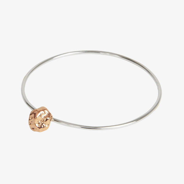 A weighty, solid charm made from Sterling Silver, inspired by the irregular, fragmentary surfaces of meteorites. Floating on a sturdy, round Sterling Silver bangle, the meteorite charm's free movement on the bangle creates a mesmerising and unique piece. Please note: Vermeil options feature a plated charm on a Sterling Silver bangle.