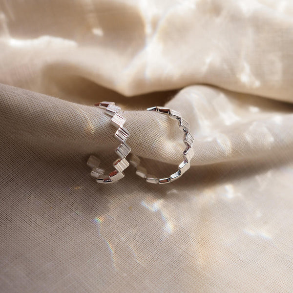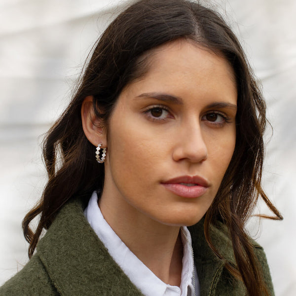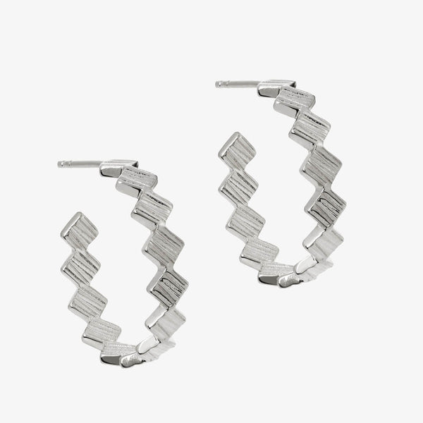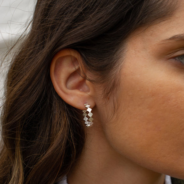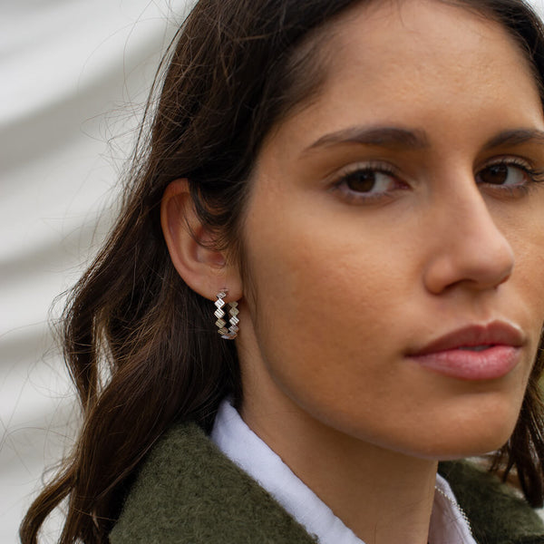 Inspired by Matthew Calvin’s original experimental designs, the Origins collection explores the juxtaposition of textures alongside high-polish finishes. These simple but eye-catching earrings feature small square textured charms, perfectly connected to catch optimum light levels. Designed carefully, the charms are reversed half-way through the hoop so the texturing is visible all the way around. An ultra wearable hoop style with maximum impact.